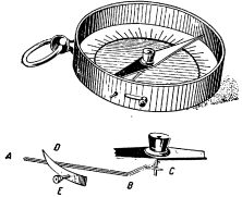 Во-вторых, надо продемонстрировать компас обычного типа (рис. 72). На этом же рисунке внизу изображён отдельно механизм арретира у компаса. Арретир состоит из ломаного рычага АВС, согнутого в точке В; вилкой С рычаг охватывает остриё, на котором надета стрелка. Тонкий конец А просунут в круглую дырочку, проделанную в боковой стенке коробочки компаса; внутри коробочки на конец А нажимает подвижной клин D, который передвигается с помощью штифтика Е, выходящего наружу через прорез в стенке; при сдвиге клина налево до отказа конец рычага А опускается, а конец С поднимается, в свою очередь поднимает стрелку над- остриём и прижимает её к стеклу.