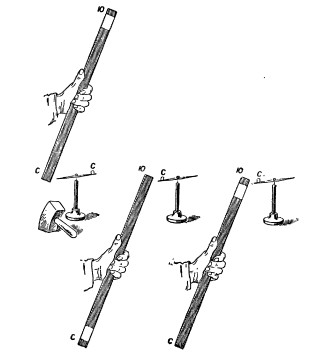 В-третьих, надо показать намагничивание железного стержня вследствие индукции под влиянием Земли. Для этого опыта пригоден далеко не всякий железный стержень. В данном случае играет главную роль химический состав стержня; для опыта нужно почти химически чистое железо, только при этом условии получается стержень с малой задерживающей (коэрцитивной) силой, как это требуется для опыта. Стержень должен быть отожжён, т. е. после накаливания в печи охлаждён очень медленно, в течение нескольких часов, например оставлен в печи в золе до её полного охлаждения. Так как обыкновенно приходится выбирать из имеющихся готовых стержней, то следует перепробовать их все и оставить для данного опыта тот стержень, с каким опыт удаётся лучше всего.