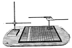 На зеркале (рис. 88) нанесён ряд продольных параллельных прямых и вдоль одного края —одна поперечная под прямым углом к параллелям; кроме того, имеется шкала, параллельная продольным линиям. Во время наблюдений зеркало должно лежать так, чтобы все продольные линии и шкала были параллельны магнитному меридиану; тогда поперечная (единственная) линия будет перпендикулярна к магнитному меридиану.