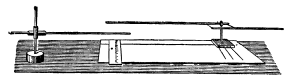 Упрощённая самодельная конструкция прибора Гримзеля изображена на рисунке 89. Упрощение заключается в замене зеркала листом белого картона (20 см х З0 см), на котором начерчены три продольные линии и одна поперечная; около края (левого на рисунке) наклеена в качестве шкалы полоска миллиметровой бумаги параллельно трём продольным линиям; под концы магнитов при установках кладётся полоска зеркала (4 см х 25 см) для устранения ошибки на параллакс. Стойка для магнита взята от магнитных весов.