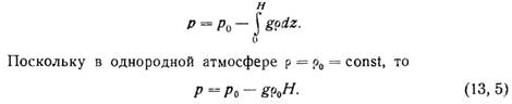 Однородная атмосфера. Однородной атмосферой называется такая, в которой плотность воздуха с высотой не изменяется, т. е. р (z) = const. Проинтегрируем уравнение статики в пределах от уровня моря (z = 0) до высоты H, на которой давление р = 0;