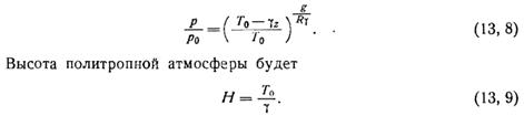 При Т0 = 273° и ϒ = 1 °/100 м Н = 27,3 км; при ϒ = 0°,5/100 м и той же Т0 И = 54,6 км. При ϒ = 3°,42/100 м H = 8 км, т. е. высота политропной атмосферы равна высоте однородной атмосферы.