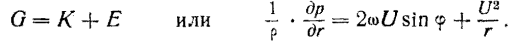 При установившемся движении должно сохраниться равновесие сил, в данном случае: барического градиента, кориолисовой и центробежной сил (рис. 115). Следовательно,