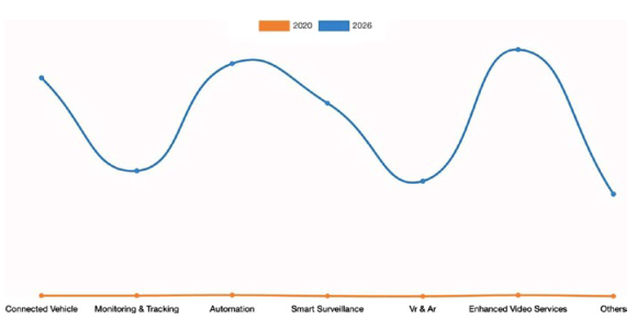 - Графики приложений показывают тенденции внедрения в различных областях, таких как подключенные автомобили, мониторинг и отслеживание, промышленная автоматизация, умное видеонаблюдение с использованием дронов, виртуальная (VR) и дополненная реальность (AR), а также улучшенные видеоуслуги.