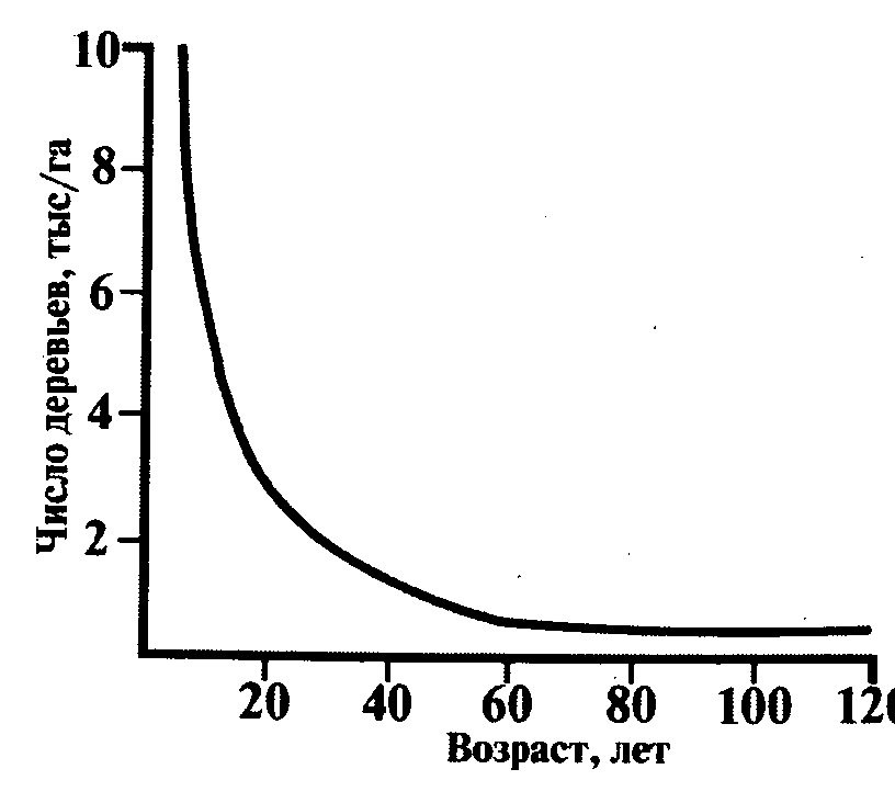 Рис. 7. Ход самоизреживания соснового леса с возрастом (по Г. Ф. Морозову)