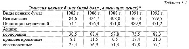 Данные таблицы показывают наращивание выпуска всех видов ценных бумаг на первичный рынок с начала 1980-х гг. Эта тенденция была обусловлена циклическим подъемом и необходимостью замены производственного аппарата в условиях глобальной конкуренции. Можно предположить, что в количественном отношении первичный рынок больше биржевого из-за большого количества новых выпусков. В стоимостном выражении биржевой рынок может превосходить первичный благодаря концентрации дорогих фондовых ценностей и воздействию спекуляций.