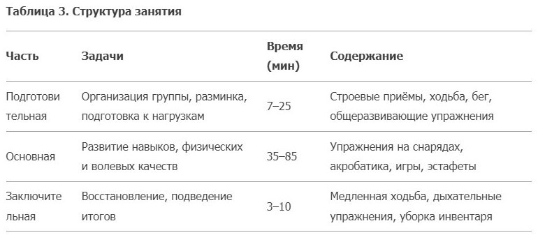 Эффективность учебного процесса определяется структурой занятия, которая включает подготовительную, основную и заключительную части (табл. 3). Каждая решает специфические задачи, обеспечивая постепенное врабатывание, пик нагрузки и восстановление. Руководитель регулирует плотность (соотношение активных действий ко времени занятия) и интенсивность (уровень воздействия упражнений на организм), опираясь на программу и физическую подготовку обучаемых.
