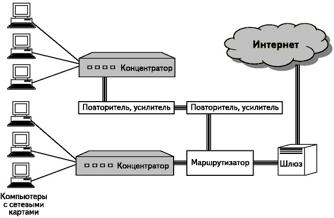Одним из ключевых компонентов является сетевая карта, или сетевой адаптер (Network Interface Card, NIC), который соединяет компьютер с сетью. Это устройство, выполняемое обычно в виде отдельной платы, имеет уникальный идентификатор, известный как MAC-адрес (Media Access Control), определяющий физический адрес компьютера в сети. Для преодоления затухания сигнала в протяженных линиях связи используются повторители (Repeater) и усилители (Amplifier). Повторитель является цифровым устройством, которое дублирует входящий сигнал с его усилением, а усилитель работает с аналоговыми сигналами, увеличивая их амплитуду.