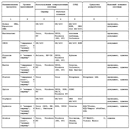 Таблица 20. Сводная таблица технических характеристик зарубежных АБС наглядно демонстрирует технологическое разнообразие современных банковских систем.