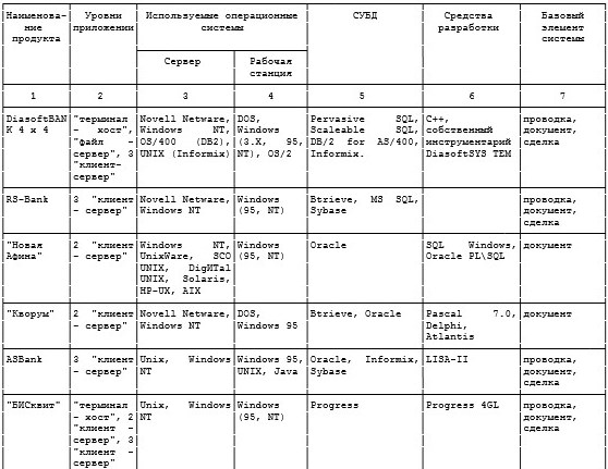 Таблица 21. Сводная таблица технических характеристик российских АБС наглядно демонстрирует это технологическое разнообразие, показывая поддержку различных уровней приложений, операционных систем и средств разработки.