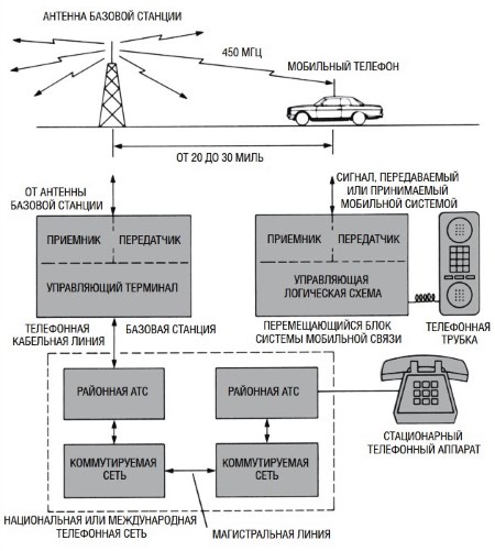 Ранние системы мобильной связи. Первые системы мобильной связи можно рассматривать как усовершенствованные аналоги бесшнуровых телефонов. Их ключевыми отличиями были мощные передатчики и высоко поднятые антенны базовых станций, обеспечивавшие покрытие в радиусе 50–80 км. Сложное мультиплексирование и детектирование позволяли одной базовой станции одновременно обслуживать до 60 абонентов. Эти технические решения и масштаб инфраструктуры были признаками, кардинально отличавшими мобильную связь от бытовой бесшнуровой телефонии.