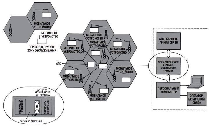 Структурная организация сотовой сети. Принципиальная структура организации сотовой связи представлена на рис. 11.6. Вся зона обслуживания делится на отдельные области — ячейки (соты), в центре каждой из которых расположена базовая станция. Это оборудование предназначено для коммутации, передачи и приема вызовов с мобильных устройств, находящихся в ее зоне ответственности. Каждая базовая станция работает на назначенных ей частотных каналах, причем один и тот же канал может быть использован одновременно в нескольких несмежных сотах, что исключает взаимные помехи.