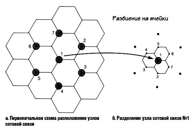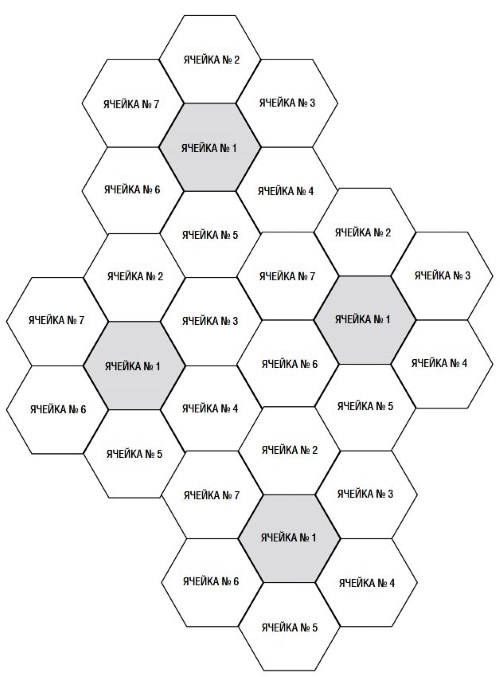 Модель идеальной шестиугольной ячейки. Для упрощения проектирования и планирования сети используется модель идеальной шестиугольной формы ячеек. Ячейкам с идентичными наборами частот присваиваются одинаковые номера, и модель шестиугольника обеспечивает, что они всегда разделены как минимум одной ячейкой с другим частотным набором. На практике реальная форма зоны покрытия далека от идеального шестиугольника и определяется рельефом, застройкой и другими факторами, однако теоретическая модель остается основой для эффективного частотного планирования.