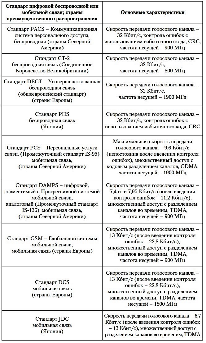 Таблица 11.1. Сводная таблица параметров беспроводных систем связи
