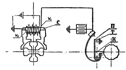 Второй конец выведен к прерывателю Я. Прерыватель Я электрически изолирован от массы и посредством кулачка К через неподвижный контакт Т может замыкать первичную обмотку (цепь) на массу и размыкать ее.