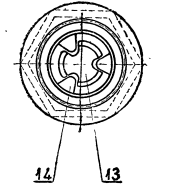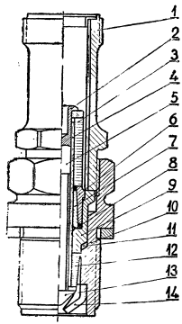 Сердечник-изолятор. Сердечник состоит из стержня 5, изолированного слюдяной трубкой 4, ниппеля 9, нижнего конуса слюдяных шайб 12, верхнего цилиндра слюдяных шайб 3, медной конусной втулки 7, которую обжимает стальная конусная втулка 6; центральный стержень на одном конце имеет контактную головку 2 для присоединения провода высокого напряжения, а на другом конце — центральный электрод свечи 13.