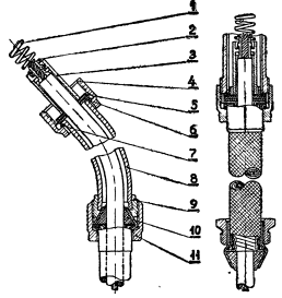 Уплотнительная резиновая шайба 5 защищает от влаги и загрязнения экран свечи, а конусная шайба 10 служит дополнительной защитой от загрязнения свечи и предохраняет гайку шланговой экранировки от самоотвинчивания. Текстолитовая шайба 6 служит упором для контактного устройства.