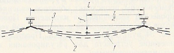 Рис. 34. Положение контактного провода простой подвески: 1 — при средней температуре, 2 при максимальной температуре, 3 — при минимальной температуре; 4 — длина опорного пролета, 5 — стрела провеса