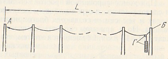 Рис. 35. Схема компенсации контактного провода: L — длина анкерного участка, А и Б опоры, Г — компенсатор