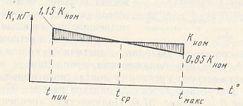Натяжение в компенсированном проводе не должно отличаться от номинального (Кном более чем на 15%, т. е. натяжение при минимальной температуре tмин не должно превышать 1,15Кном, а при максимальной температуре tмакс — быть меньше 0,85 Кном. Сказанное иллюстрируется графиком изменения натяжения компенсированного контактного провода, изображенным на рис. 36.