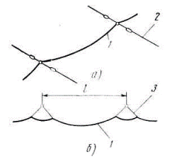 Рис. 37. Схема полужесткого крепления простой подвески: а — на поперечных тросах, б — с оттяжными тросами: 1 — контактный провод; 2 — поперечный трос; 3 — оттяжной трос