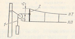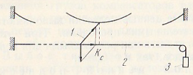Рис. 45. Влияние наклона струны на натяжение в контактном проводе: 1 — наклоненная струна. 2 — контактный провод. 3 — компенсатор; Кс — дополнительное усилие от струны