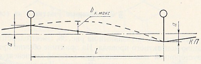 Схема отклонения контактного провода под действием ветра на прямом участке пути показана на рис. 49. Наличие зигзагов а контактного провода требует уменьшения длины пролета l из-за смещения провода от оси токоприемника в точке его наибольшего выноса bк.макс. По той же причине сокращается длина пролета на кривых участках пути. Чем круче кривая, тем больше это сокращение из- за увеличения смещения провода от оси токоприемника. На ветровое отклонение контактного провода влияет конструкция подвески, натяжение проводов и скорость ветра.