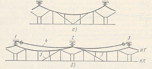 Рис. 51. Схема средней анкеровки цепной подвески: а — полукомпенсированной, б — компенсированной; 1, 2 и 3 — опоры для крепления подвески и тросов, 4 — дополнительный трос, 5 — наклонные