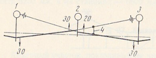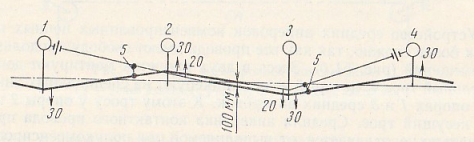 Для правильного перехода токоприемника с одной ветви цепной подвески на другую место подхвата должно быть по возможности ближе к переходной опоре, а ветви отходящих на анкеровку цепных подвесок должны монтироваться с постепенным подъемом от переходной к анкерным опорам. Надежное электрическое соединение между сопрягаемыми анкерными участками осуществляется при помощи продольного электрического соединения 4. На рис. 52 и на последующих рисунках стрелки и цифры у опор показывают направление и величину зигзага в сантиметрах.