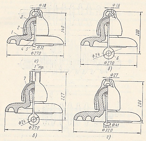 Рис. 57. Тарельчатые изоляторы: а — ПМ-4,5 с пестиком (малогабаритный), б — П-4,5 с серьгой, в — П-4,5 фиксаторный, г — П-8,5. с пестиком; 1 — фарфоровая тарелка, 2 — цементный раствор, 3 — шапка, 4 — стержень, 5 — пестик, 6 — серьга, 7 — шапка с муфтой