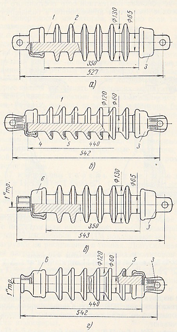 На рис. 58 показаны стержневые изоляторы. Их фарфоровый стержень 1 имеет несколько юбок 2 и две шапки 3 или 3 и 6 из ковкого чугуна но концам. Шапки с фарфоровым стержнем соединены при помощи цементного раствора 4.