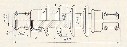 Рис. 59. Консольный стержневой изолятор ИКС-27,5: 1 - фарфоровый стержень, 2 юбка с капельницей, 3 — шапка, 4 — хомуты крепления