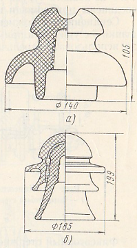 На рис. 57 изображены тарельчатые изоляторы ПМ-4,5, П-4,5 и П-8,5 (ГОСТ-6490-67). Они состоят из фарфоровой ребристой тарелки 1 с полой круглой головкой, на которую цементным раствором 2 прикреплена снаружи шапка 3 из ковкого чугуна или стали, а изнутри — стержень 4 с круглой головкой (пестиком) 5 или серьгой 6. Шапка изолятора имеет сверху фигурный вырез для соединения с пестиком или внутреннюю резьбу диаметром 1".