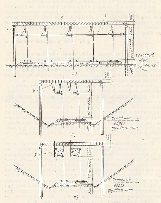 Схемы опор с жесткими поперечинами показаны на рис. 66. В качестве опор 1 жестких поперечин применяют консольные железобетонные опоры длиной 13,6 м (как правило, конические) или раздельные длиной 11,2 м. Жесткие поперечины являются поддерживающими конструкциями и выполняются в виде металлической пространственной фермы.