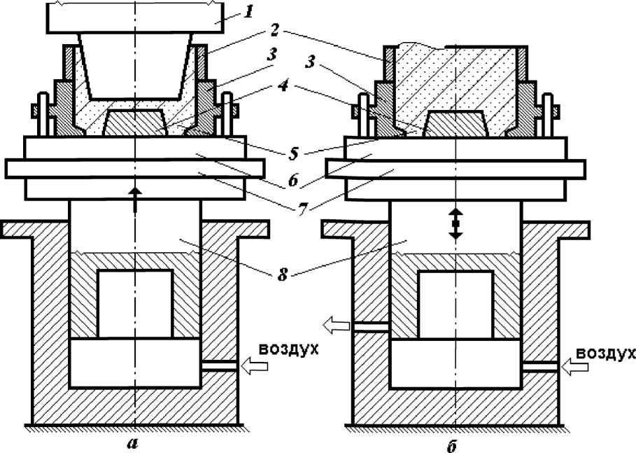Уплотнение смеси методом прессования осуществляется с использованием сжатого воздуха. Как показано на рисунке 3.9 а, опока (3) с наполнительной рамкой (2) устанавливается на модельную плиту (6), закрепленную на рабочем столе (7), и заполняется формовочной смесью (5). Поршень со столом поднимается под действием воздуха, поступающего в цилиндр (8), в результате чего смесь уплотняется, упираясь в прессовую колодку (1). Прессовые машины характеризуются высокой производительностью, но имеют существенный недостаток.