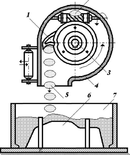 Пескометный метод формовки основан на подаче и уплотнении смеси с помощью кинетической энергии. Согласно рисунку 3.10, формовочная смесь (2) поступает в головку пескомета (4), где захватывается ковшом (1), закрепленным на вращающемся роторе (3). Ковш формирует пакет смеси (5) и с силой выбрасывает его в опоку (7). Соударение пакета с моделью (6) и модельной плитой приводит к последовательному уплотнению всей полуформы, для чего головка пескомета перемещается над опокой.