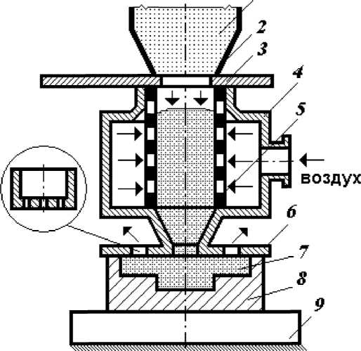 Пескодувный метод формовки (рисунок 3.11) реализуется за счет подачи смеси в форму или стержневой ящик (8) потоком сжатого воздуха. Основным уплотняющим фактором выступает кинетическая энергия песчано-воздушной струи. Формовочная смесь (1) из бункера (2) через шибер (3) поступает в гильзу (5) головки (4), откуда воздухом выдувается в полость ящика. Для выхода воздуха предусмотрены специальные каналы – венты (6).