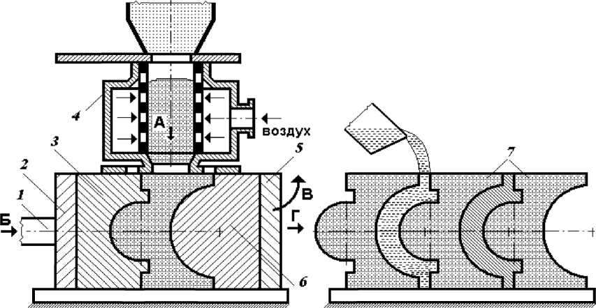 В рассмотренных процессах опоки являются обязательным элементом формовочной оснастки. Однако применение безопочной формовки (рисунок 3.12) позволяет значительно снизить затраты, ускорить охлаждение отливок и упростить их выбивку. В данном процессе пескострельная головка (4) заполняет смесью пространство между двумя модельными плитами (2, 5) с полумоделями (3, 6), осуществляя предварительное уплотнение (этап А).
