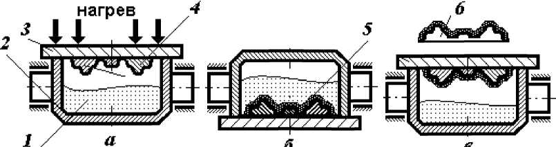 Технологический цикл изготовления оболочковой полуформы на специальных машинах включает несколько этапов, подробно показанных на рисунке 3.14. Изначально нагретую до 200...250°С модельную плиту (3) покрывают разделительным составом. Далее бункер (2) с формовочной смесью (1) накрывают плитой и переворачивают (рис. 3.14 б), обеспечивая равномерную засыпку. Смесь, содержащая кварцевый песок и фенолформальдегидную смолу, спекается, образуя оболочку (5) толщиной 6...12 мм.