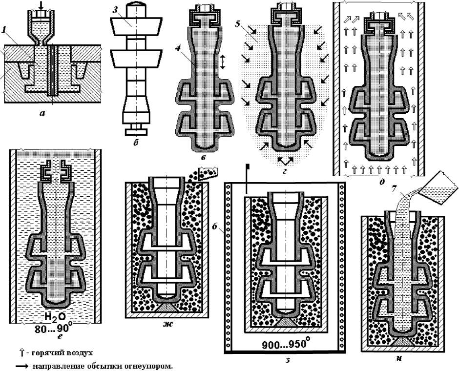 Технология ЛВМ, представленная на рисунке 3.15, начинается с изготовления модельных звеньев (1) в пресс-форме (2) из состава, например, парафина и стеарина. Эти звенья собирают в модельный блок (3) с литниковой системой. Далее блок многократно окунают в огнеупорную суспензию (4) на основе гидролизованного этилсиликата, каждый раз обсыпая огнеупором (5) и просушивая (рис. 3.15 в-д). После набора требуемой толщины стенки форму нагревают, выплавляя модель (рис. 3.15 е).