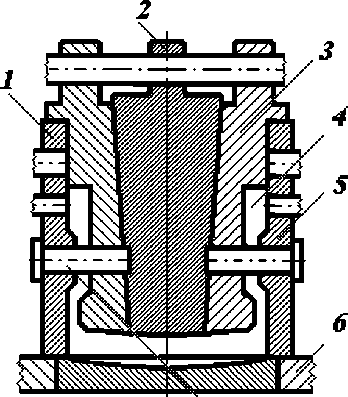 Конструктивно кокили, изготавливаемые из чугуна или стали, бывают разъемными и неразъемными. Для формирования внутренних полостей применяют металлические или песчаные стержни. На рисунке 3.17 показан кокиль для поршня, состоящий из двух половин (1, 5), нижней плиты (6) и сложного разъемного центрального стержня (2, 3). Технологический цикл включает подогрев кокиля, нанесение защитного покрытия, сборку, заливку, охлаждение и извлечение отливки.