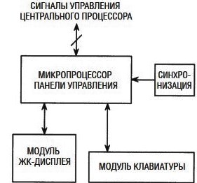 Взаимодействие микропроцессоров в системе. Использование дополнительного микропроцессора для управления панелью разгружает центральный процессор, повышая общую производительность системы. Этот подчиненный процессор непрерывно обменивается данными с главным. Он передает ему команды, введенные пользователем, и одновременно получает от центрального микропроцессора информацию о состоянии системы для отображения на экране. Упрощенная схема, демонстрирующая архитектуру и связи панели управления, показана на Рис. 9.20. Такое разделение обязанностей между процессорами создает отзывчивый и интуитивно понятный интерфейс для оператора.