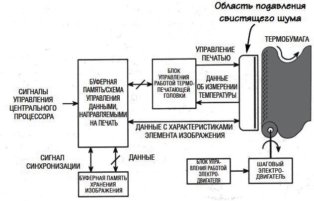 Подготовка данных и эволюция методов печати. Перед началом печати данные изображения из основной буферной памяти передаются в буферную память печатающего устройства. Здесь они преобразуются в специфические сигналы управления, которые непосредственно контролируют механизмы нанесения изображения на бумагу. Исторически основным методом был метод построчной термопечати. Как показано на блок-схеме Рис. 9.21, изображение формировалось на рулонной термобумаге за один проход термопечатающей головки, которая точечно нагревала поверхность.