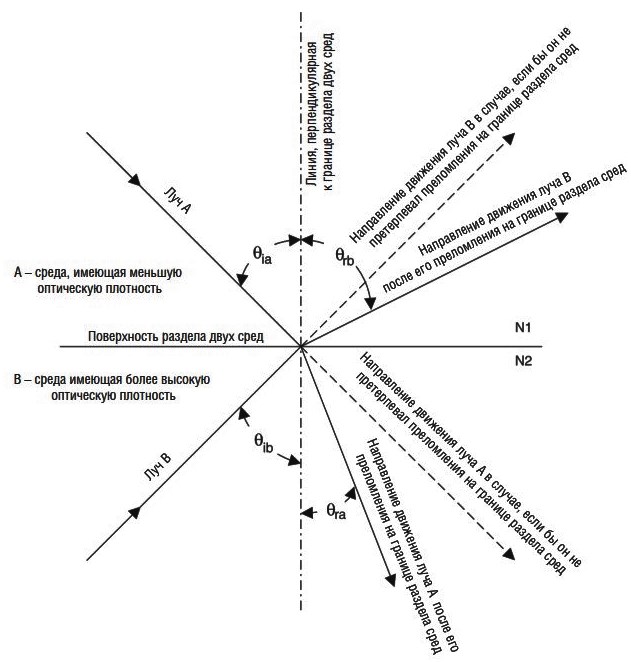 Явление преломления света на границе раздела сред. Явление преломления представляет собой изменение направления распространения светового луча при прохождении через границу раздела двух сред с различными коэффициентами преломления. На рис. 10.2 изображены два материала N1 и N2 с коэффициентами преломления n1 и n2 соответственно. Чем больше разница в оптической плотности двух сред, тем значительнее будет преломление светового луча.
