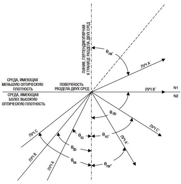 Критический угол и полное внутреннее отражение. Особый интерес для волоконной оптики представляет случай, когда световой луч переходит из оптически более плотной среды в менее плотную. На рис. 10.3 показана система с тремя лучами, падающими на границу раздела под разными углами. Луч А падает под докритическим углом θia и расщепляется на отраженную и преломленную компоненты. Луч В подходит к критическому углу θib, после чего он распространяется параллельно интерфейсу.