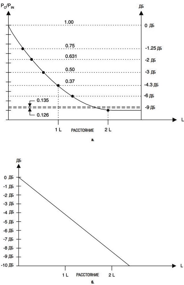 Сравнение графиков на рис. 10.12а и рис. 10.12б наглядно иллюстрирует преимущество использования логарифмической шкалы. Выраженная в децибелах зависимость эффективно линеаризует исходную экспоненциальную зависимость, преобразуя ее в прямую линию. Это позволяет существенно упростить инженерные расчеты, так как суммарные потери в сложной системе, состоящей из нескольких элементов, могут быть найдены простым арифметическим сложением значений потерь каждого элемента, выраженных в дБ. Такой подход избавляет от необходимости перемножать множество коэффициентов ослабления, делая анализ и проектирование систем более наглядными и эффективными.