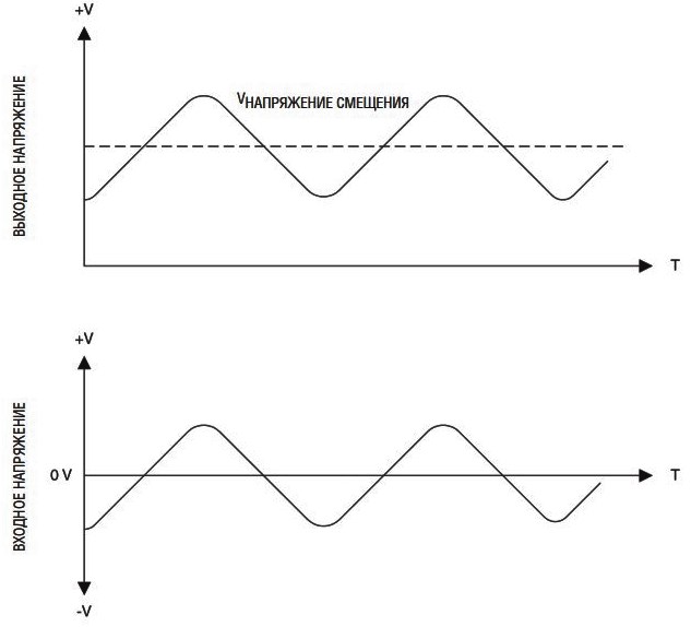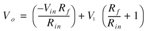 Использование смещения позволяет эффективно передавать сигналы с отрицательной полярностью, которые будут уменьшать яркость свечения СИД, но не выключать его полностью. Это предотвращает срез отрицательной полуволны сигнала. Если же сигнал является монополярным, напряжение V1 настраивается так, чтобы СИД apenas включался при нулевом уровне Vin. Сигнал Vin поступает на инвертирующий повторитель, коэффициент усиления которого задается соотношением резисторов (-Rf/Rin). Таким образом, общее выходное напряжение Vo относительно уровня смещения описывается формулой (10-27).