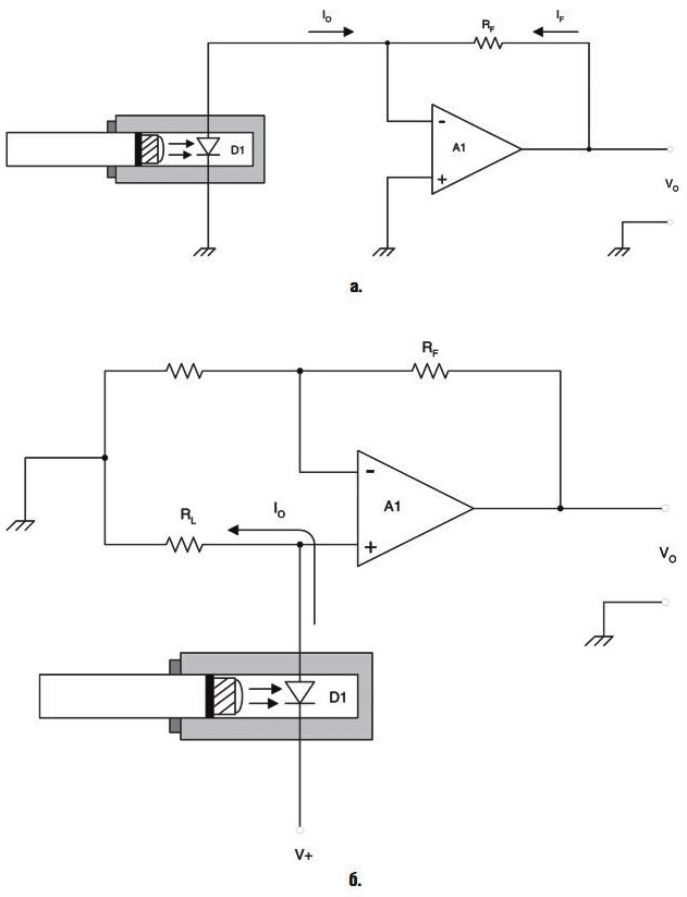 В схеме на рис. 10.17а реализована инвертирующая цепь повторителя. Фотодиод подключен к заземленному неинвертирующему входу ОУ, а его ток поступает на инвертирующий вход. Ток обратной связи If компенсирует ток диода, в результате чего выходное напряжение описывается простым соотношением: Vo = –Io * Rf (формула 10-30). В альтернативной схеме на базе неинвертирующего повторителя (рис. 10.17б) ток диода создает падение напряжения V1 на резисторе нагрузки RL. Выходное напряжение для этой конфигурации определяется выражением (10-31).