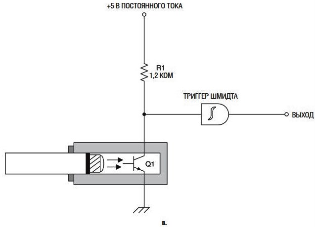 При освещении базы фототранзистора он открывается, и напряжение на его коллекторе падает до десятых долей вольта. В отсутствие света транзистор закрыт, и напряжение на коллекторе близко к напряжению питания +V. Восстановление формы импульса осуществляется в следующем каскаде с помощью триггера Шмидта. Это устройство осуществляет резкий переход в состояние ВЫСОКОГО УРОВНЯ, когда входное напряжение превышает верхний порог, и возвращается в НИЗКИЙ УРОВЕНЬ лишь при снижении напряжения ниже нижнего порога. Благодаря гистерезису, триггер Шмидта формирует четкий цифровой сигнал на выходе, даже если входной сигнал сильно искажен и «смазан».