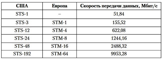 Иерархия скоростей в стандартах SONET и SDH. Стандарт SONET, используемый преимущественно в Северной Америке, определяет пропускную способность на электрическом уровне в виде STS-n (Synchronous Transport Signal), где индекс n принимает значения 1, 3, 12, 24, 48, 192 и другие. Соответствующий оптический сигнал, передаваемый по волокну, обозначается как OC-n (Optical Carrier). Европейский стандарт SDH оперирует понятием STM-n (Synchronous Transport Module), где типичные значения n равны 1, 4, 8, 16, 64. Несмотря на то, что некоторые уровни производительности этих стандартов функционально эквивалентны (см. Таблицу 6.4), форматы кадрирования и служебной информации в них различаются, что делает невозможным их прямое взаимодействие без преобразования.